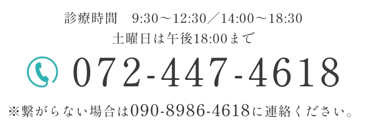 ※繋がらない場合は090-8986-4618アクセス 貝塚駅より徒歩8分 駐車場 8台完備 診療時間 月 火 水 木 金 土 日・祝 9:30~12:30