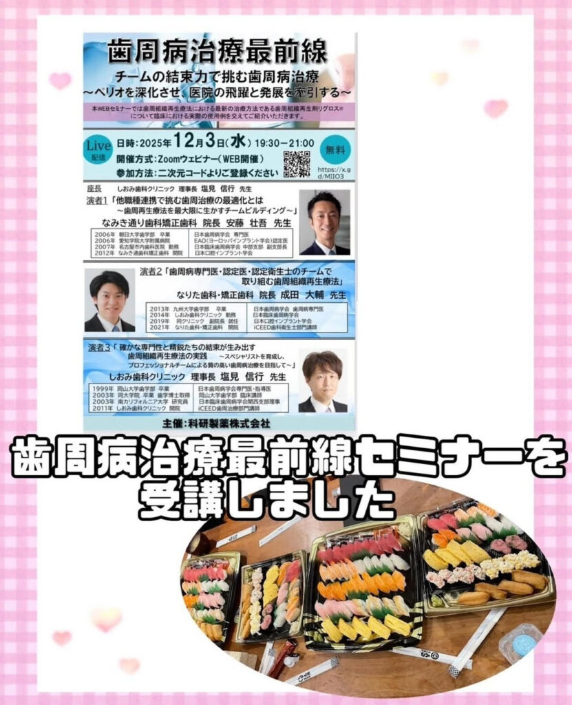 先日、科研製薬様主催の「歯周病治療最前線」セミナーを、院長と歯科衛生士全員で受講させていただきました👨‍🔬👩🏼‍🔬