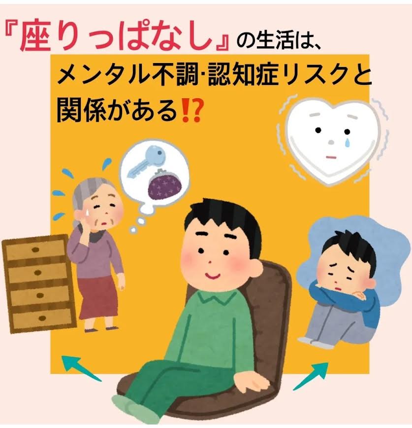 長時間座りっぱなしの生活は、🧠 メンタル不調👴 認知症リスクと関係があると言われています。