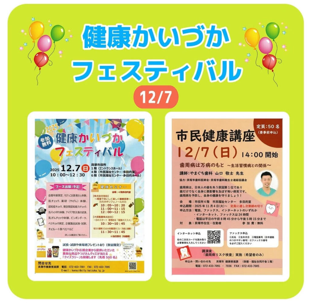 12月7日(日)に、貝塚市役所で「健康かいづか!フェスティバル」が開催されます🎈
