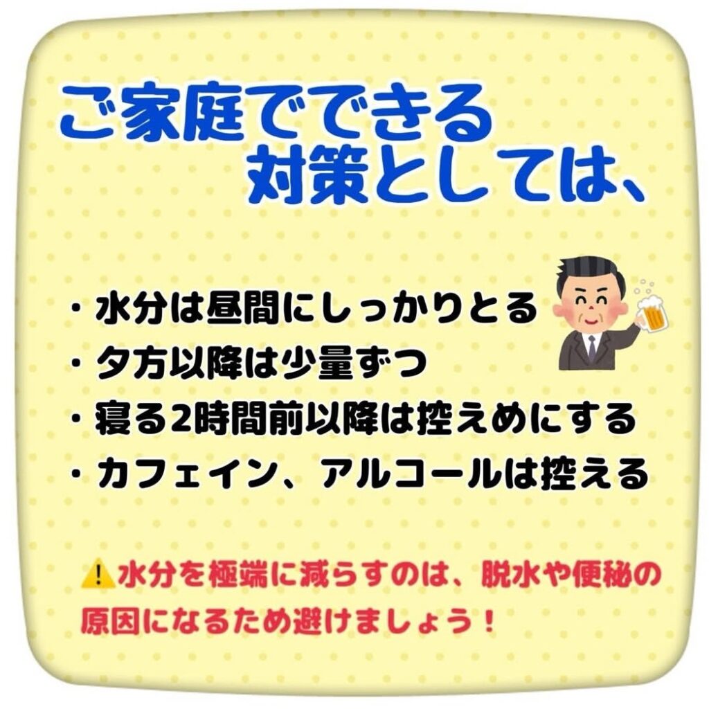 ご家庭でできる対策としては、・水分は昼間にしっかりとる・夕方以降は少量ずつ・寝る2時間前以降は控えめにする・カフェイン、アルコールは控えるなどがあります☕🍺(⚠水分を極端に減らすのは、脱水や便秘の原因になるため避けましょう)